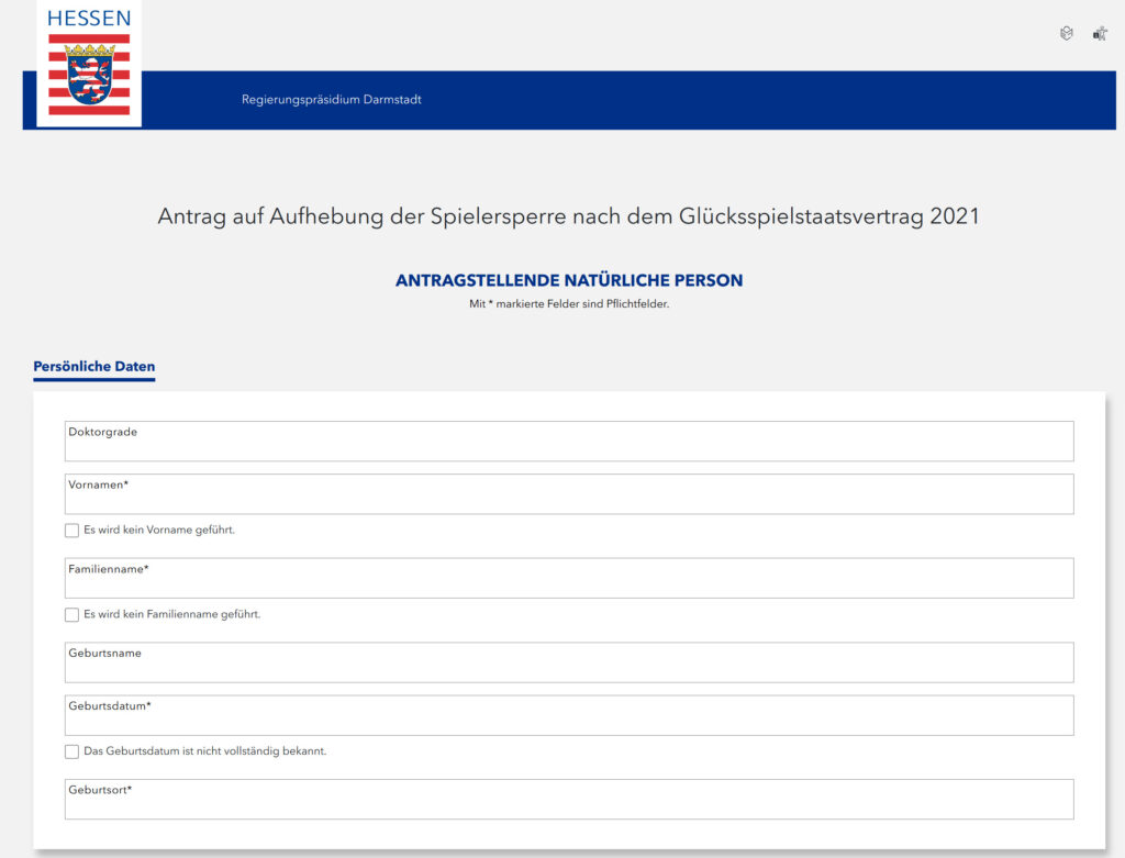 So sieht der Online Antrag zur Aufhebung der Spielersperre nach dem GlüStV aus